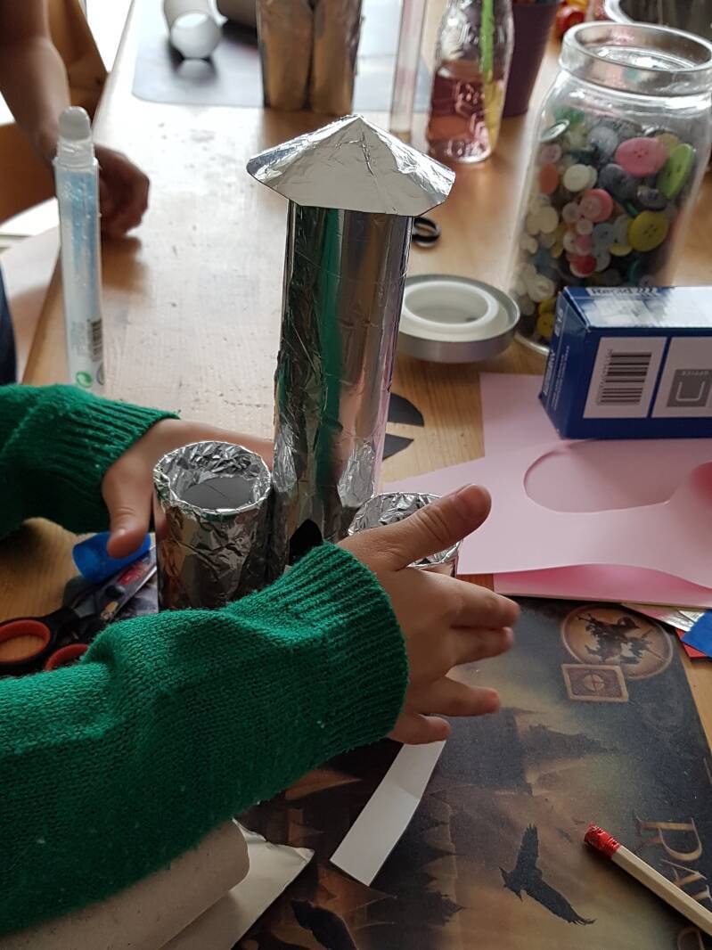 Van keukenrollen, gewikkeld in aluminium folie en versiert met de mooiste glimmende papiertjes, werden raketten gemaakt. Sommige werden nog uitgebreid met trapjes en extra wc-rol motorkracht. Daarna een "hoedje" op de raket en klaar. Fabian kwam met het idee om crêpe papier als "vuurstralen" te gebruiken. En zo gebeurde.